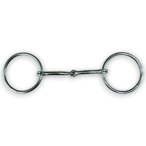 Fabricado em aço inox , livre de ferrugens. Bocal fino tornando-o ação leve na boca do animal, com articulação central. Hastes em formato de argola em aço inox nas laterais, articuladas. Produto resistente, prático e de fácil fixação no animal. Medida aproximada: Comprimento do Bocal: 12 cm