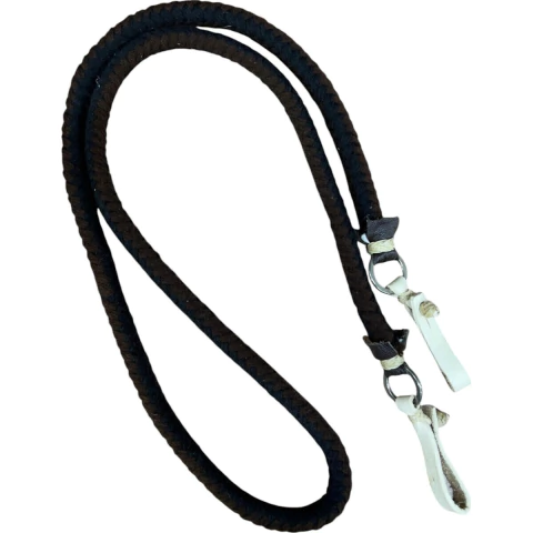 Rédea confeccionada em lã de excelente qualidade torcida, altamente resistente possui acabamentos em charroa de couro para dar resistência na rédea e também argolas em aço inox com biqueiras para fechamento, em couro. Produto resistente, bonito e confortável.